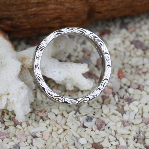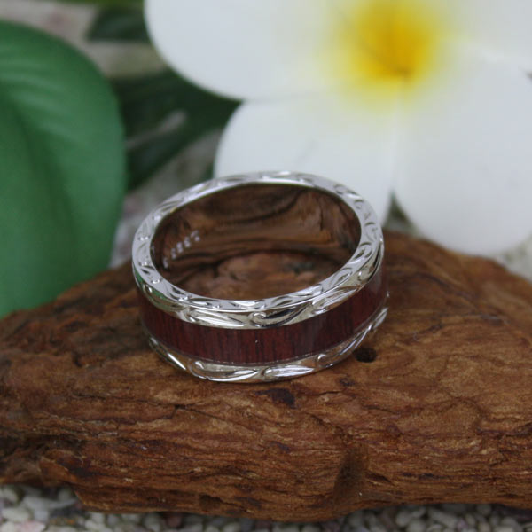 コアウッドを囲むように、シルバーにスクロールを刻み込んだ、ハワイアンジュエリーの魅力が凝縮されたリング。