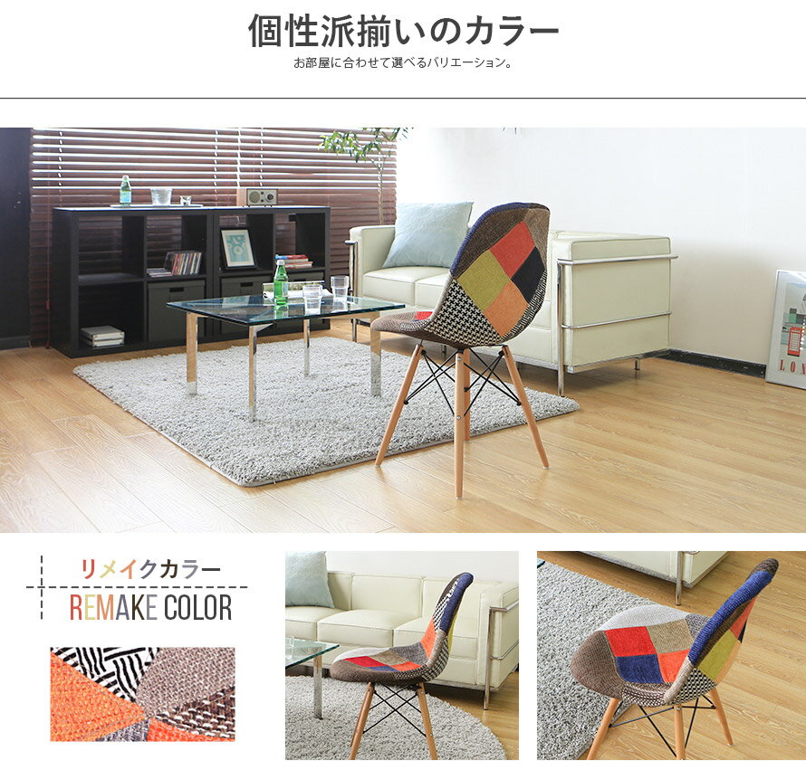 送料無料(沖縄・離島はご注文後お見積り) 座面カラー リメイクカラー、ブルーマルチ、ブラウンマルチ、モノクローム 脚カラー ナチュラル、ブラウン サイズ 横幅約47㎝×高さ約82㎝(座面高さ約44.5㎝) 材質 座面…ABS樹脂、ファブリック 脚部…ビーチ材(ブナ)ウレタン仕上げ 特徴 イームズチェア リプロダクト 選べる座面&脚カラー 木製脚 脚部用傷防止パーツ付 保証 3年間保証 完成品について 完成品をご希望される場合は、別途1,500円を頂きます。