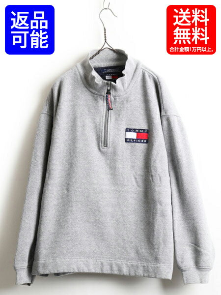 90s ■ TOMMY HILFIGER トミーヒルフィガー ジップ ハイネック プルオーバー 鹿の子 裏起毛 スウェット ( メンズ 男性 大きい XL ) 古着 灰| 【US古着】【古着】中古 トミー トレーナー ハイネック ジップネック フラッグ ロゴ ワッペン 刺繍 スエット 90年代 ハーフジップ