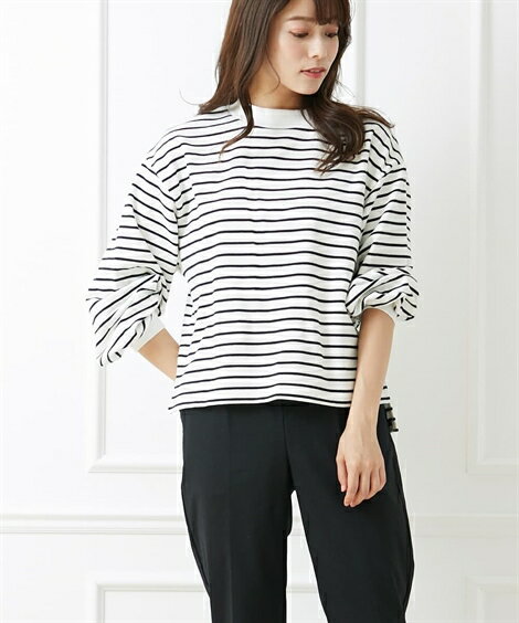 トレーナー レディース 洗濯機で洗える オーバーサイズプチ ハイネック 裏毛ボーダー プルオーバー カットソー オフホワイト×黒/グレー×オフホワイト/黒×オフホワイト M/L ニッセン